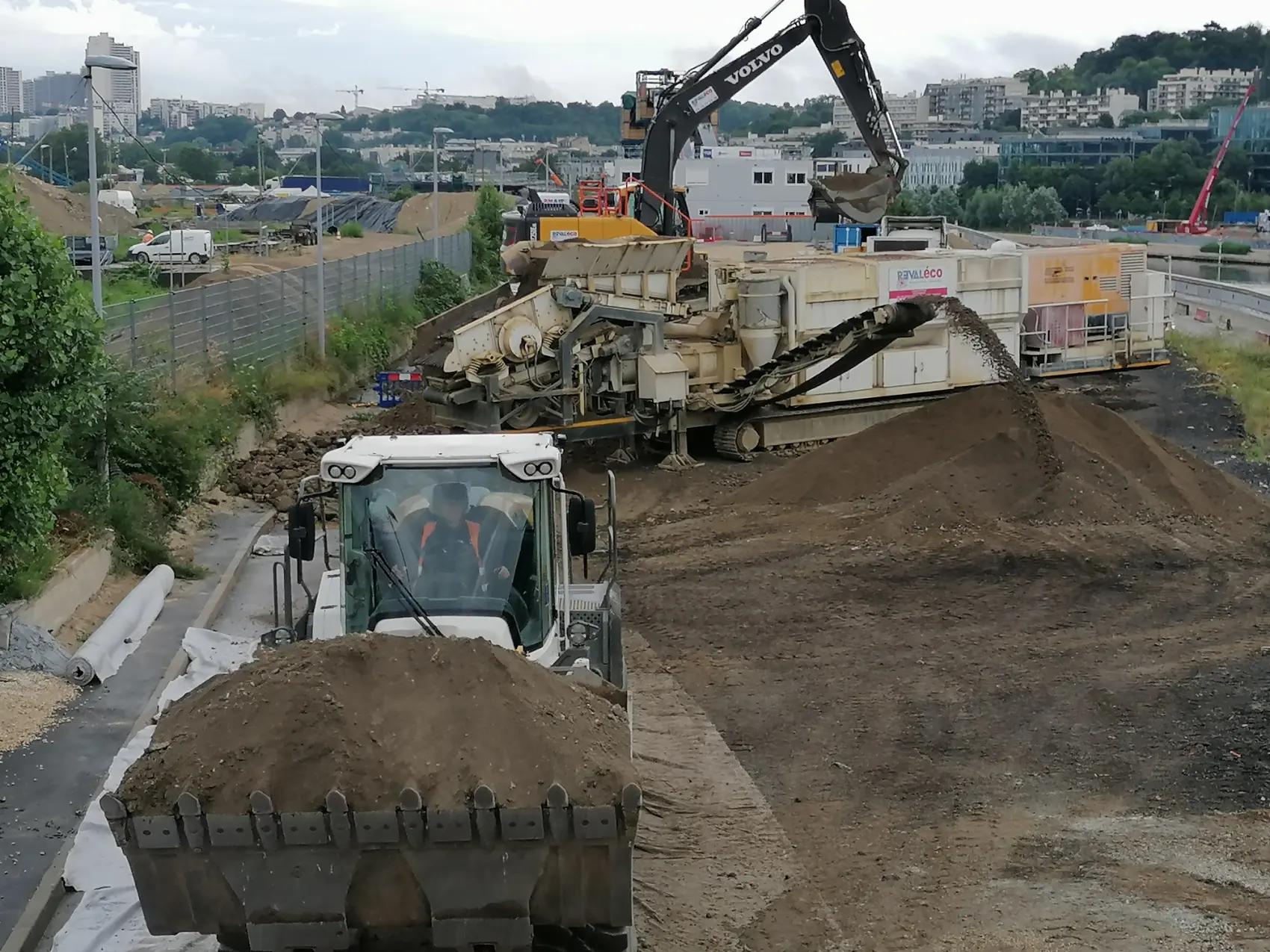 Grâce à notre machine REVALECO 009, nous valorisons vos déblais directement sur site. Cette approche réduit les transports, limite les émissions de GES et transforme vos déchets en matériaux réutilisables, dans une logique d’économie circulaire.